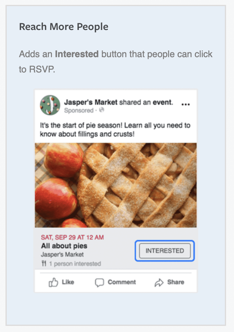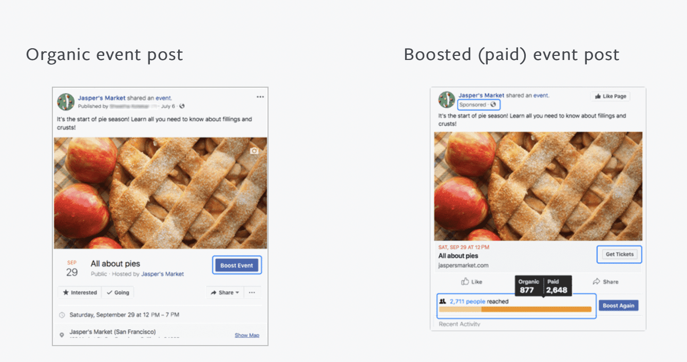 Boosting an event: Turns it into an ad that can appear in people’s News Feed. Adds a Sponsored label at the top of the ad. Lets you include either a “Get tickets” or “Interested” button. In order to run this type of ad, you first need to create an event.