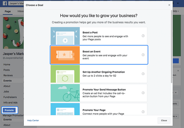 Select the Promote button on your Page, and then select Boost Event as the promotion type.