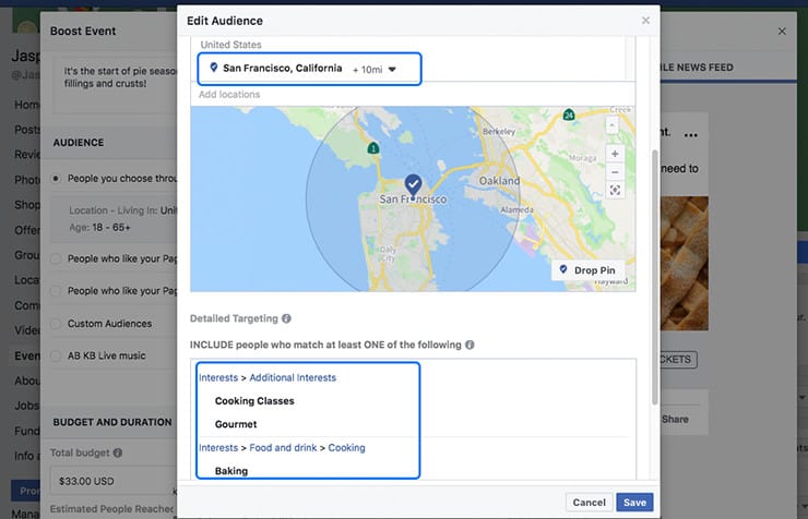 You have several ways to build your audience, whether it’s through interests and geographic location or how they’re connected with your Page. For an event boost, focus on geographic targeting to reach people close enough to make it to your event.
