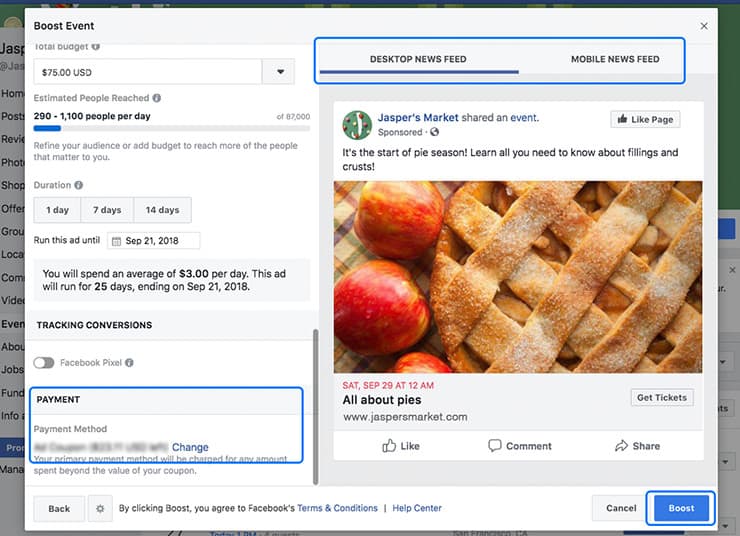 Preview what your ad will look like in Desktop and Mobile News Feed. When you’re happy with everything, select Boost.